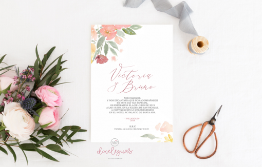 La acuarela y una caligrafía cuidada son los protagonistas de esta invitación. Delicada y romántica.