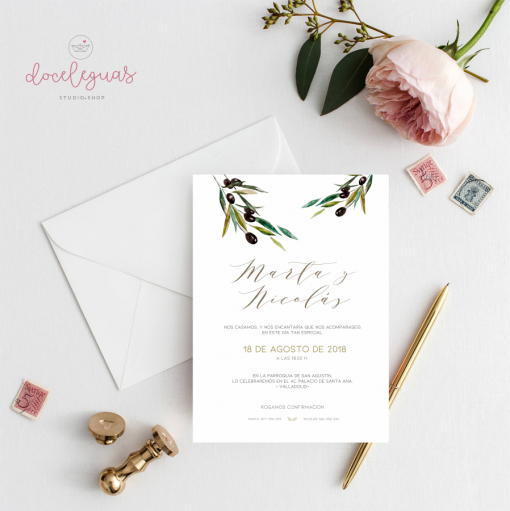 - La cara principal aparecen toda la información acompañada de una preciosa caligrafía que se complementa con unas delicadas ramas de olivo en acuarela.