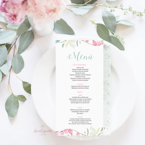 Minuta con flores en acuarela, ideal para bodas sencillas y de tonos suaves.